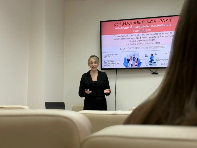 В качестве спикера выступила Дарья Легостаева — клиентский менеджер Центра «Мой бизнес», сопровождающая предпринимателей по вопросам заключения социального контракта с момента запуска проекта в регионе. В рамках лекции она подробно осветила ключевые аспекты государственной поддержки, которую можно получить по социальной программе.