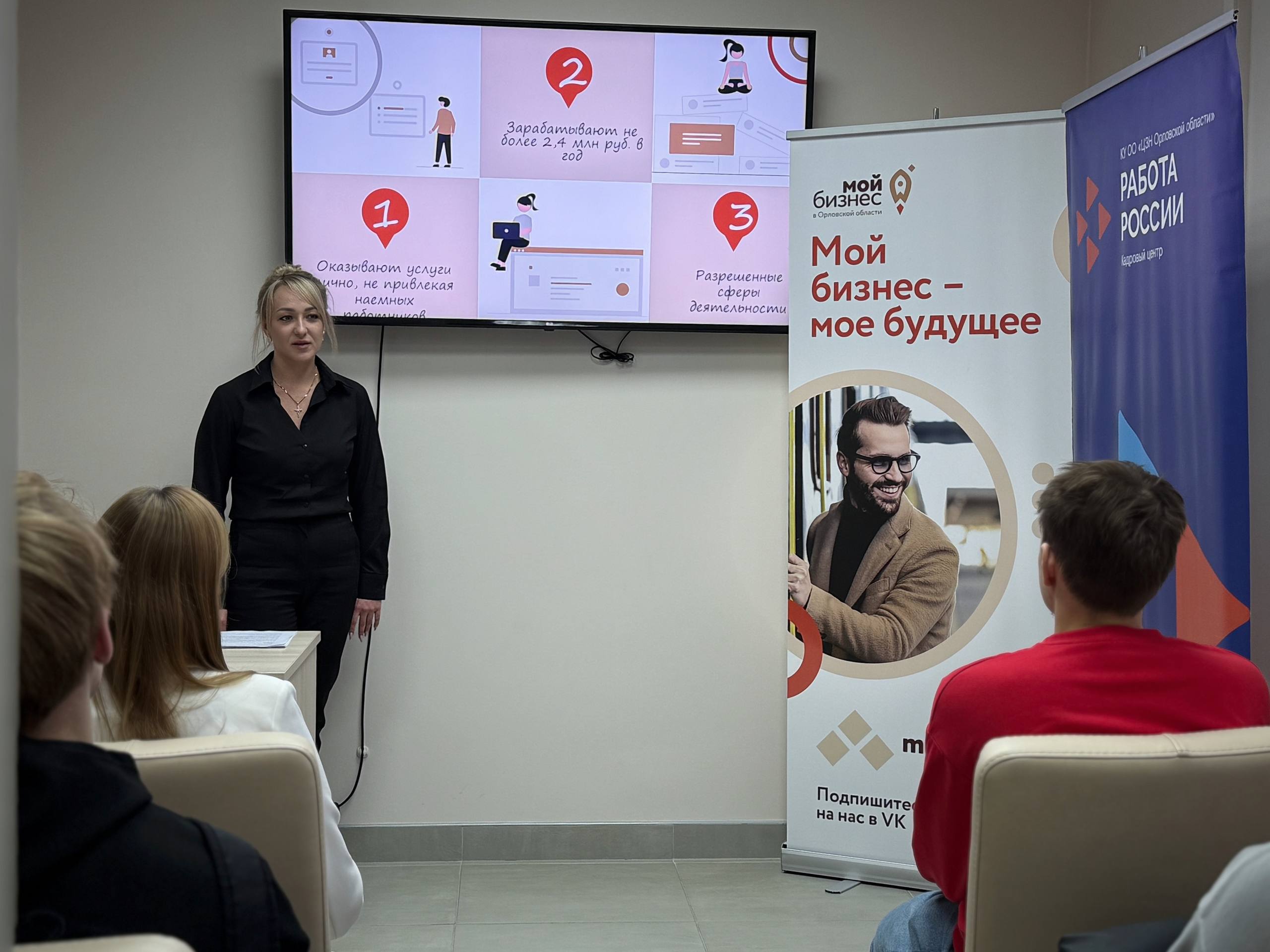 Студентам рассказали, кто может оформить статус самозанятого, какие преимущества даёт этот формат работы, как проходит регистрация и какие меры поддержки доступны начинающим предпринимателям. Лекцию «Хочу свой бизнес: с чего начать» провела клиентский менеджер Центра «Мой бизнес» Дарья Легостаева. В обсуждении также приняла участие руководитель пресс-службы Кадрового центра Орловской области Александра Рязанова.