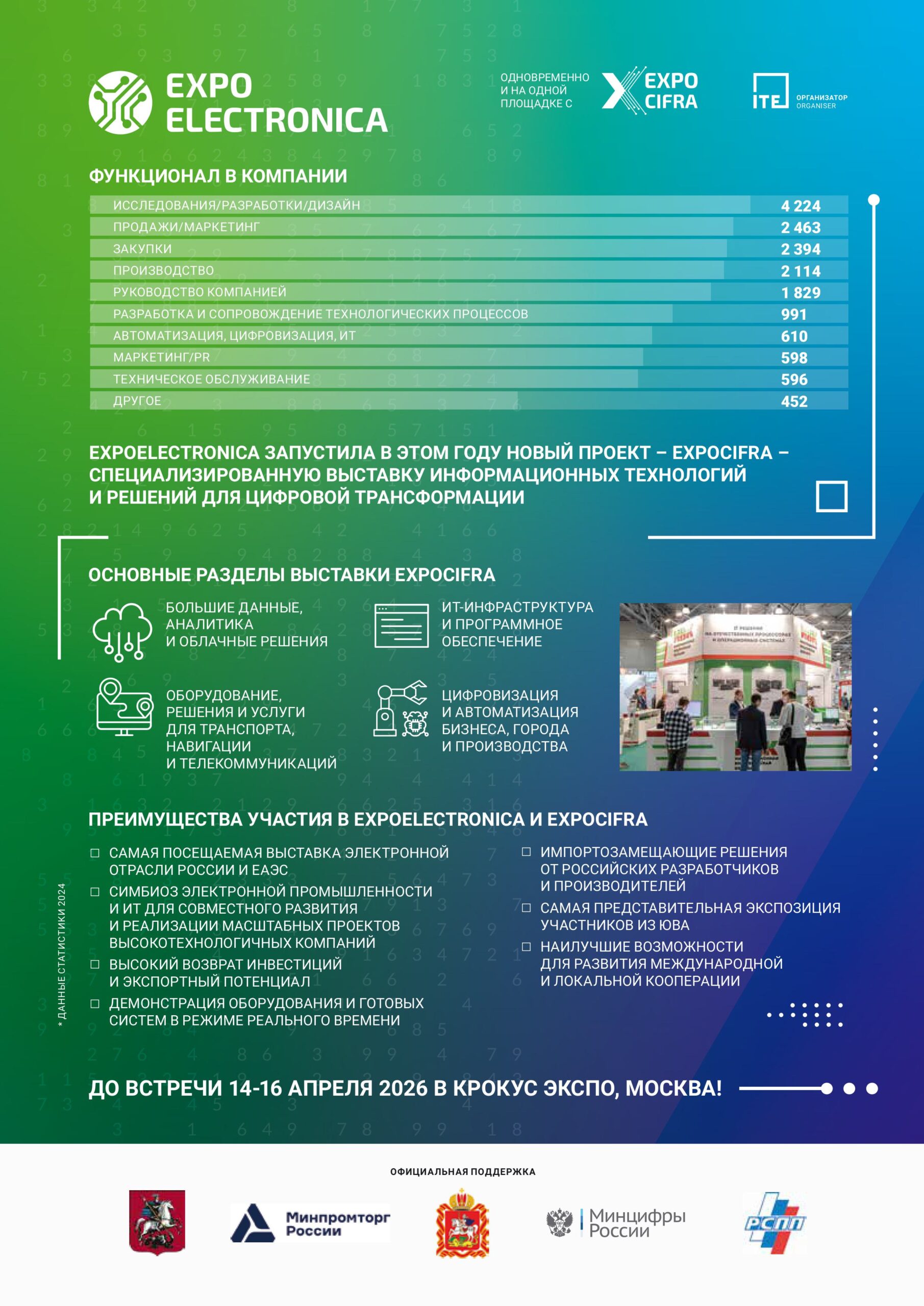 В условиях активной цифровизации экономики и развития отечественных технологий участие в ExpoCifra и ExpoElectronica станет эффективным инструментом продвижения и взаимодействия для представителей бизнеса и промышленности.